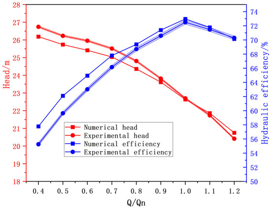 Complementary experimental measurements were conducted following the original test protocol. These measurements aimed to acquire extended pump performance data. Figure 1 comparatively presents the numerically predicted versus experimentally measured characteristics. The analysis covers head (red curves) and hydraulic efficiency (blue curves) across the full operational range. Here, efficiency specifically refers to hydraulic efficiency, where experimental values are derived through ηhe = η/(ηv × ηm), with η representing total efficiency, ηv representing volumetric efficiency, and ηm representing mechanical efficiency. Based on a systematic evaluation of manufacturer-provided engineering datasets, the volumetric-mechanical efficiency coefficient (ηv × ηm) was determined as 80% [34]. Experimental uncertainty bounds are quantified via shaded bands surrounding the measurement curves.