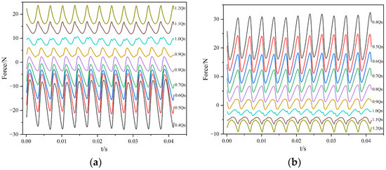 To ensure systematic analysis, we extracted two complete impeller rotation cycles from each dataset. This extraction captured periodic stabilization characteristics. Figure 2 presents the comparative time-domain trajectories of X/Y-direction radial forces across nine representative flow conditions (0.4 Qn–1.2 Qn, with 0.1 Qn increments). The results reveal significant differences in magnitude, fluctuation amplitude, and waveform characteristics between the two orthogonal forces. This demonstrates the inherent complexity of radial forces acting on the centrifugal pump impeller.