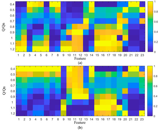 Figure 3 illustrates the normalized feature datasets for FX, FY and FT across varying flow conditions. The horizontal axis denotes feature indices, with specific parameter designations corresponding to each index provided in Table 1 or Table 2. The ordinate, ordered from top to bottom, represents nine distinct flow conditions, ranging from 0.4 Qn to 1.2 Qn. This graphical representation facilitates systematic and intuitive examination of the relative variations exhibited by each feature within the time series of X- and Y-directional hydraulic radial forces, as well as their resultant force, across different flow rates.