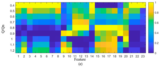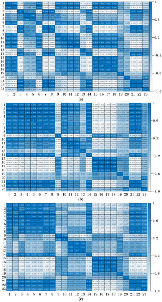 Adopting the methodological framework established through prior correlation analysis, the Pearson correlation coefficients for all pairwise feature combinations are systematically computed and visualized in Figure 5. Figure 5a–c display heatmaps generated from pairwise correlation analysis of 23 equidimensional feature vectors extracted from FX, FY and FT sources, respectively. Each vector corresponds to a distinct operational feature, encompassing nine discretized radial force measurements collected across hydraulic conditions spanning 0.4 Qn to 1.2 Qn.
