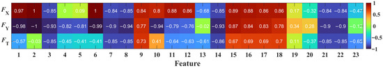 Correlation coefficients between each feature pairs: (a) FX; (b) FY; (c) FT.