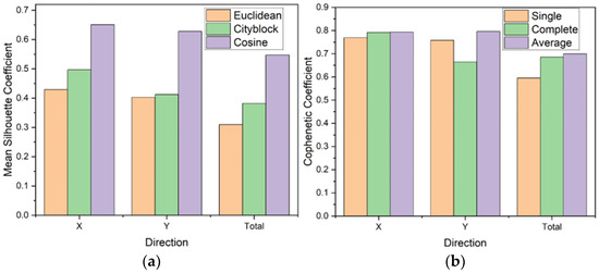 The selection of appropriate distance metrics and linkage strategies is based on a single-variable controlled approach. Under this approach, clustering performance under varying parameter configurations is systematically evaluated. Initially, the linkage strategy is held constant. Three distinct distance metrics (‘Euclidean’, ‘Cityblock’, and ‘cosine’) are applied sequentially to the FX, FY and FT data subsets. Each subset is partitioned into three clusters. Clustering effectiveness is quantitatively evaluated using the mean Silhouette Coefficient, with comparative results presented in Figure 7a.