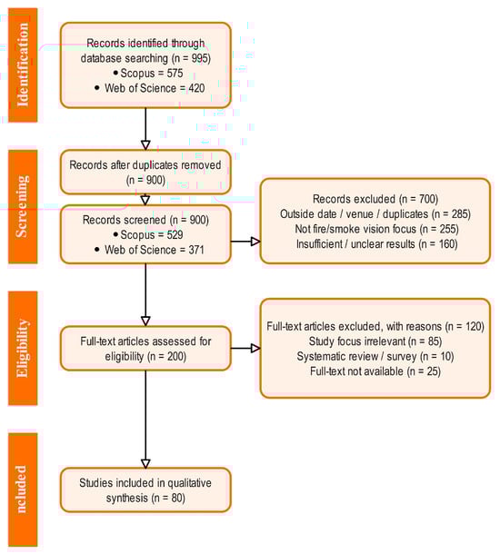 | [88] | 2025 | Improved YOLOv8 | FPS = 131.36 | Custom dataset (20,044 imgs: flames, sparks, smoke) | Industrial, forest, indoor/outdoor | Precision = 82.1%; Recall = 71.8% |