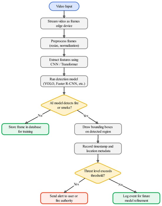 - Federated and Distributed Learning: Federated learning enables collaborative training across distributed devices without centralizing sensitive data, thereby improving dataset diversity, ensuring privacy, and reducing communication overhead [175]. Frameworks such as TensorFlow Federated, PySyft, or NVIDIA Clara FL can be applied to large-scale surveillance networks for real-time wildfire monitoring. Future systems should investigate hybrid approaches that combine federated learning with edge-cloud orchestration to achieve scalability and robustness.