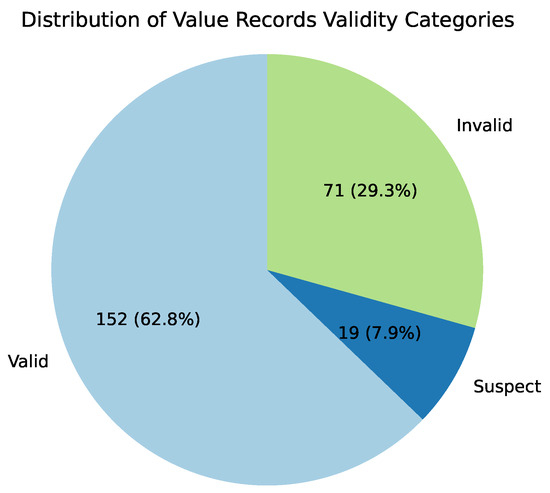 The approach introduced four formulas for validating sustainability indicator values [36]. These formulas assess whether a given value lies within a specified range, defined by minimum and maximum thresholds, and evaluate its proximity to a central or average value. This central value, reflecting the central tendency of the indicator’s distribution, can be measured using the arithmetic mean, median, or mode. The arithmetic mean represents the average of all values, the median is the middle value when ordered, and the mode is the most frequently occurring value. The values closer to the central tendency are assigned higher validity, whereas those further away are assigned lower validity. The rate at which validity decreases with increasing deviation from the mean can vary depending on the metric. In cases where a value falls outside the defined minimum or maximum, it may be classified as invalid or still acceptable depending on the metric. The parameters for these validations can be adjusted for each specific metric [36].
