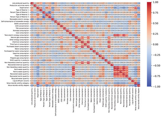 For a given batch, data was collected on environmental sustainability indicators related to the resources consumed and outputs produced during a specific production activity, aimed at transforming and manufacturing a product of a defined weight. The following environmental impact metrics were analyzed regarding consumption: consumption of water, non-renewable electricity, renewable electricity, self-consumption of renewable energy, biomass, coal, total electricity, natural gas, propane gas, fuel oil, water, gasoline, diesel, purchased steam, chemical products, etc. The following environmental impact metrics were analyzed regarding production: quantity of SVHC (Substance of Very High Concern) in products, quantity of non-hazardous chemicals, quantity of recovered chemicals, quantity of non-hazardous waste, quantity of solid waste, quantity of textile waste, quantity of recovered waste, quantity of recovered textiles, quantity of recycled water, and volume of liquid effluent, among others. Some environmental impact metrics make more sense for some production activities and less, or no sense at all, for others.