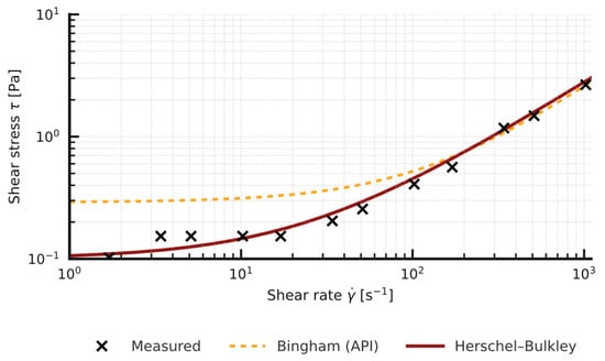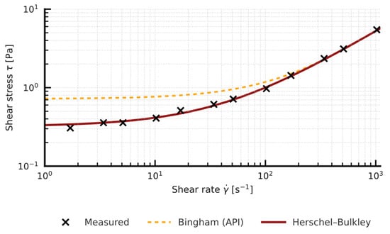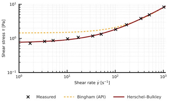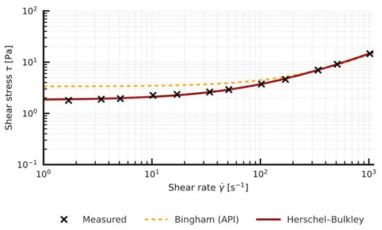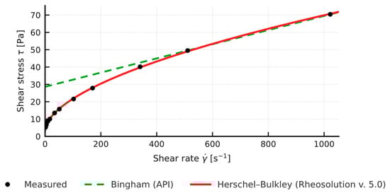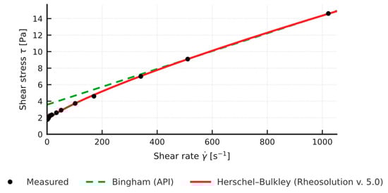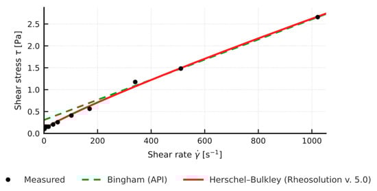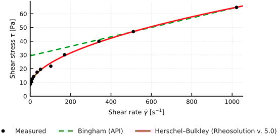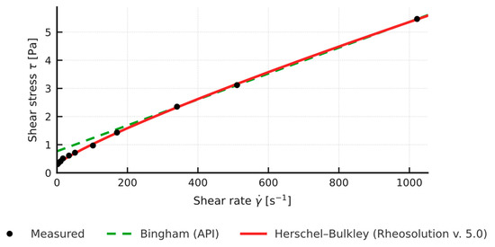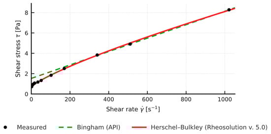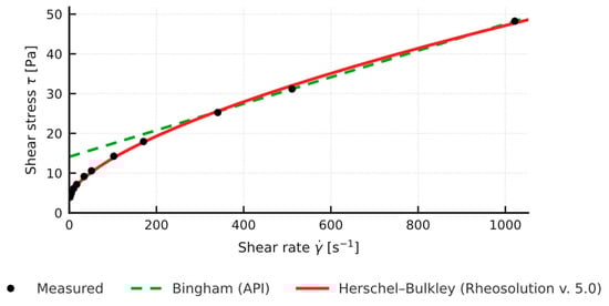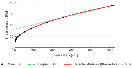 Comparison of the yield stress obtained with the simplified API method (two-point Bingham, YP) and the value τ0 from the non-linear Herschel-Bulkley model shows a systematic overestimation by the two-point approach: in the tested samples (n in the range 0.83 to 0.88) YP (API) is about 2 to 3 times higher than the corresponding τ0 (HB) (Figure 2, Figure 3, Figure 4 and Figure 5). Full rheograms generated in Rheosolution (Figure 6, Figure 7, Figure 8, Figure 9, Figure 10, Figure 11, Figure 12 and Figure 13) reveal that the Bingham line cuts the τ axis well above the HB curve, which confirms that the linear model artificially stiffens the response. Relying only on this two-point approximation can therefore lead to overestimating pressure losses in the circulation system, adopting pump rates that are too high, and targeting an unnecessarily high mud viscosity, all of which inflate circulation costs. Additional rheological plots for the polymer-modified samples (Figure 10, Figure 11, Figure 12 and Figure 13) show a strong match with the Herschel-Bulkley model and a clear mismatch with the linear Bingham fit.