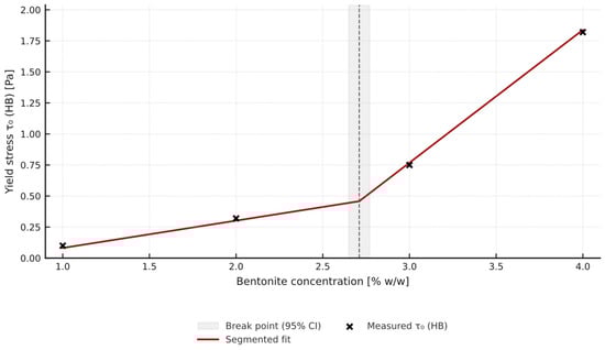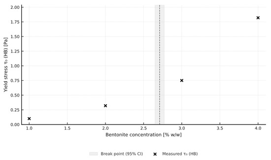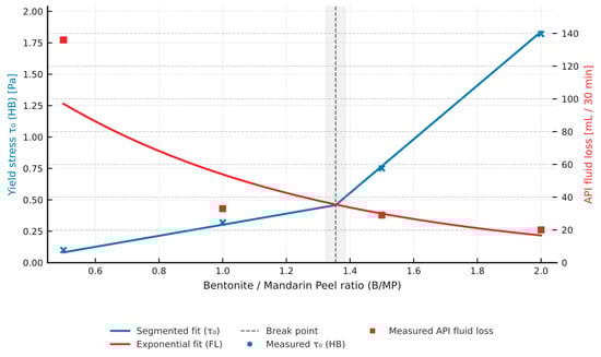 The primary objective is to identify the break point in rheological and filtration parameters as a function of the bentonite-to-mandarin-peel ratio at a fixed MP concentration of 2% (w/w). In practical terms, the aim was to find the minimum bentonite share below which yield stress drops sharply and fluid loss surges, making further reduction unjustified. To achieve this, formulations containing 1 to 4% bentonite were analyzed using segmented regression with the Davies test, and the break point was located with an estimated precision of about 0.05 percentage points of bentonite (Davies’ test, details in Section 2.3 and Section 2.4 (statistical procedures)) [,]. The result is a chart that correlates the B/MP ratio with yield stress and fluid loss, allowing laboratory staff to assess quickly whether a recipe falls within a safe operating window.