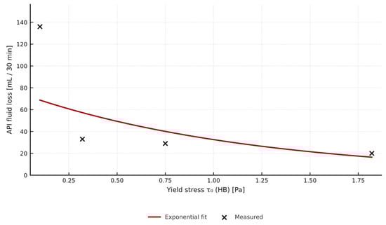 The observed trend confirms the filter-cake formation mechanism as τ0 increases, the cake becomes denser and more compact, which lowers its permeability and reduces the fluid-loss volume [,].