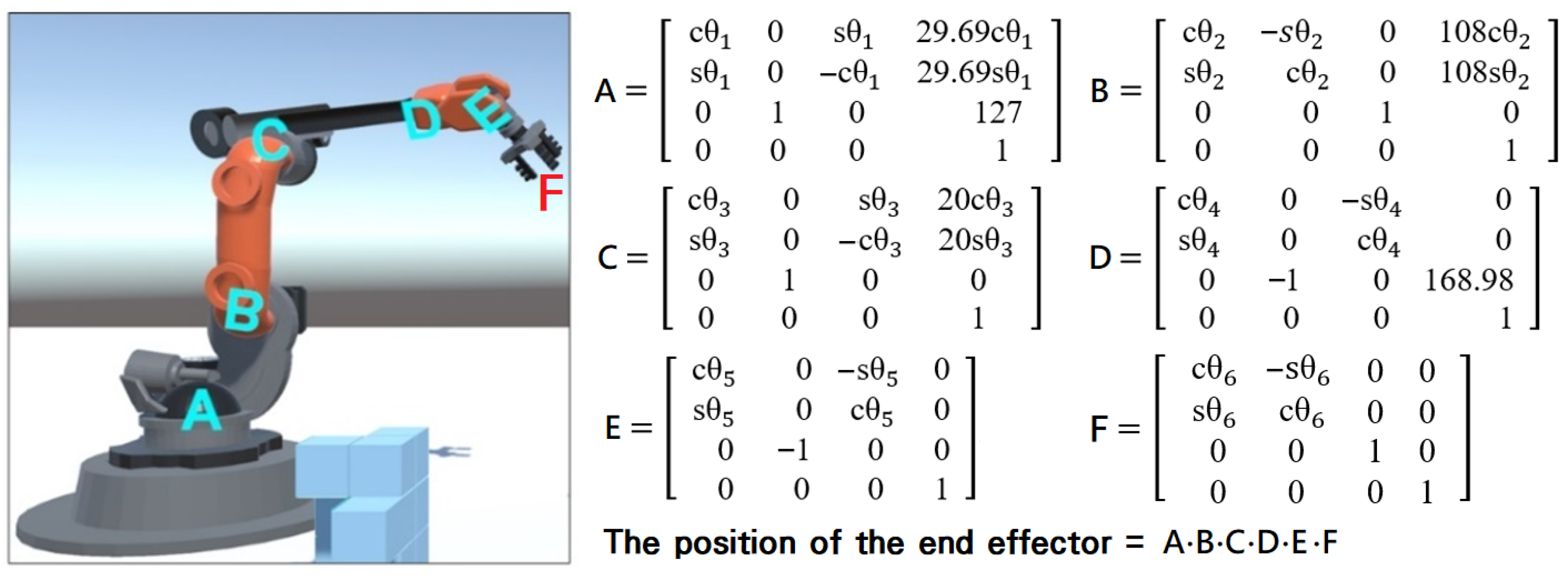23]. The system employed the Denavit–Hartenberg (DH) convention to represent the kinematic chain, defining each joint’s coordinate system and corresponding transformation matrices. Using these DH parameters, the transformation matrix for each joint was calculated, enabling precise simulation of the arm’s motion in three-dimensional space. This approach allowed users to manipulate the virtual arm interactively, visualizing spatial vector relationships while maintaining fidelity to the real-world robotic specifications, supporting both learning and experimentation.