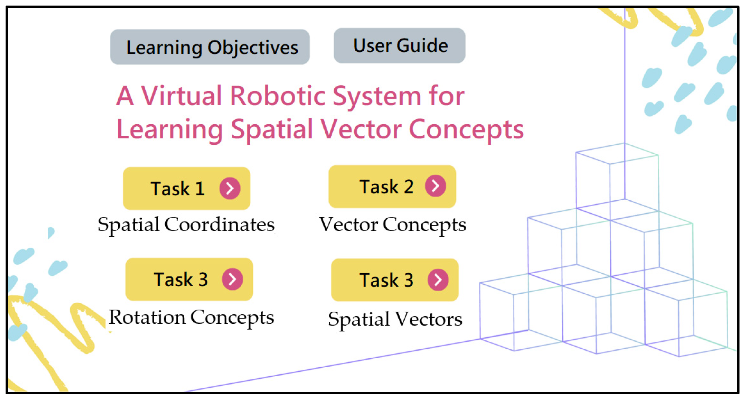 The virtual robotic system developed in this study was structured around four core tasks aligned with the learning progression and stages of cognitive development: (1) Spatial Coordinates, (2) Vector Concepts, (3) Rotation Concepts, and (4) Spatial Vectors. Each task incorporated interactive activities and instructional content designed to progressively guide students from fundamental spatial positioning to the contextual application of spatial vector concepts.