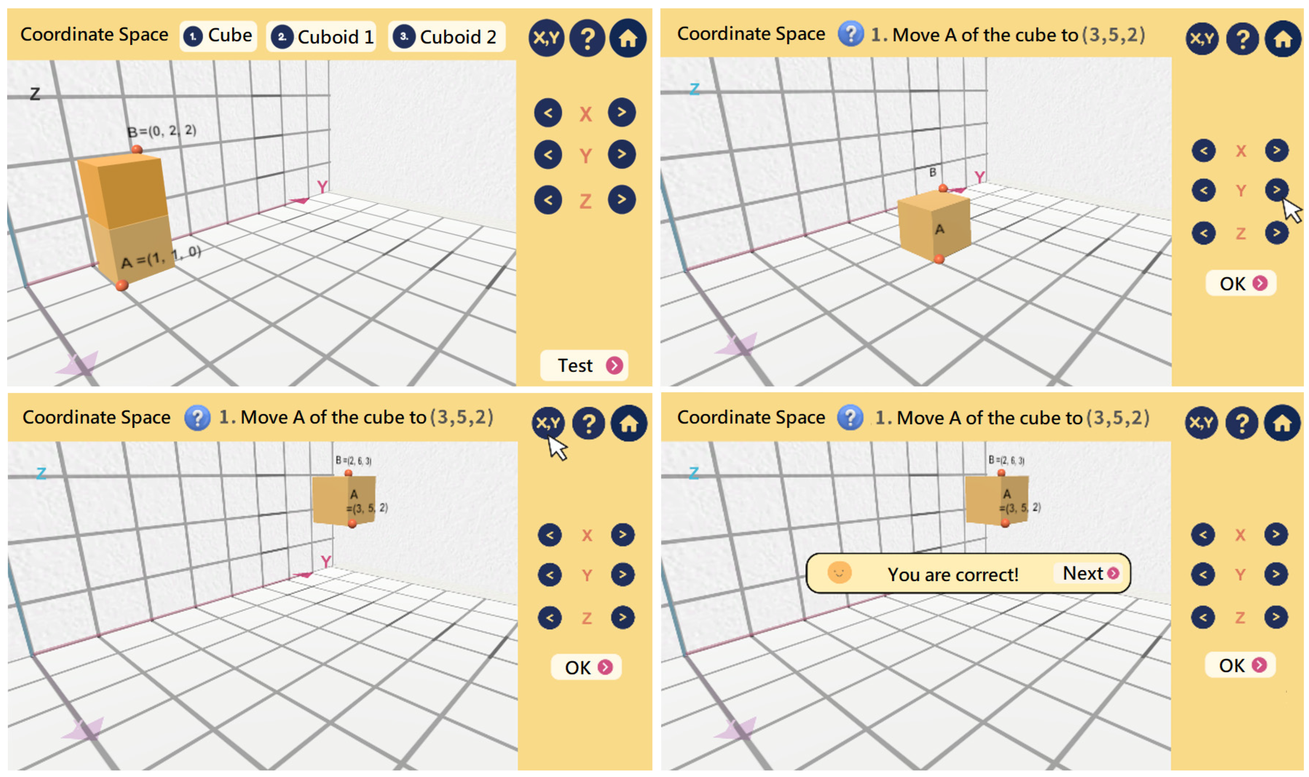 In addition, the system includes a built-in assessment activity in which learners are instructed to move a specific vertex of the cube to a given coordinate. This target-positioning exercise enhances learners’ spatial accuracy and supports the development of basic skills in coordinate transformation and spatial estimation. Learners can use the arrows next to X, Y, and Z to adjust the square’s position on the screen. They can click the (X,Y) button to display the coordinates of the current point A and point B. After pressing the confirmation button, a feedback message immediately appears to inform learners whether point A has been moved to the correct position (