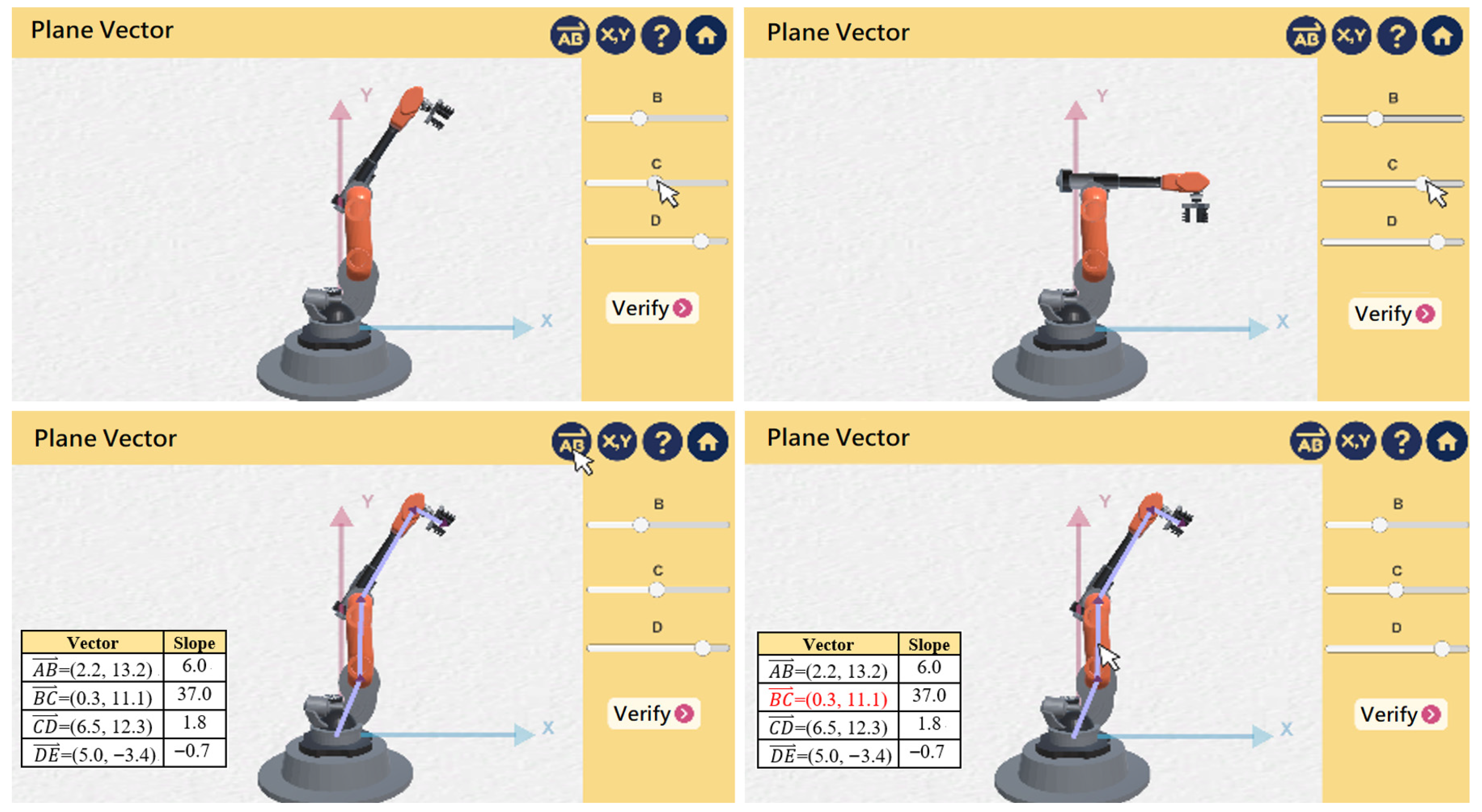 This task is designed to help learners develop the basic concepts of plane vectors and understand the correspondence between vectors and coordinate points. Through visualizing the movement of a virtual robot in a 2D plane, the interactive operation allows learners to directly observe the changes in the vectors generated when the robotic arm moves between different coordinate points. Through such operations, learners can gradually understand the direction and magnitude of spatial vectors, as well as the geometric meaning of their differences with the coordinates and their slopes in various problem-solving contexts, enhancing overall mathematical reasoning skills.