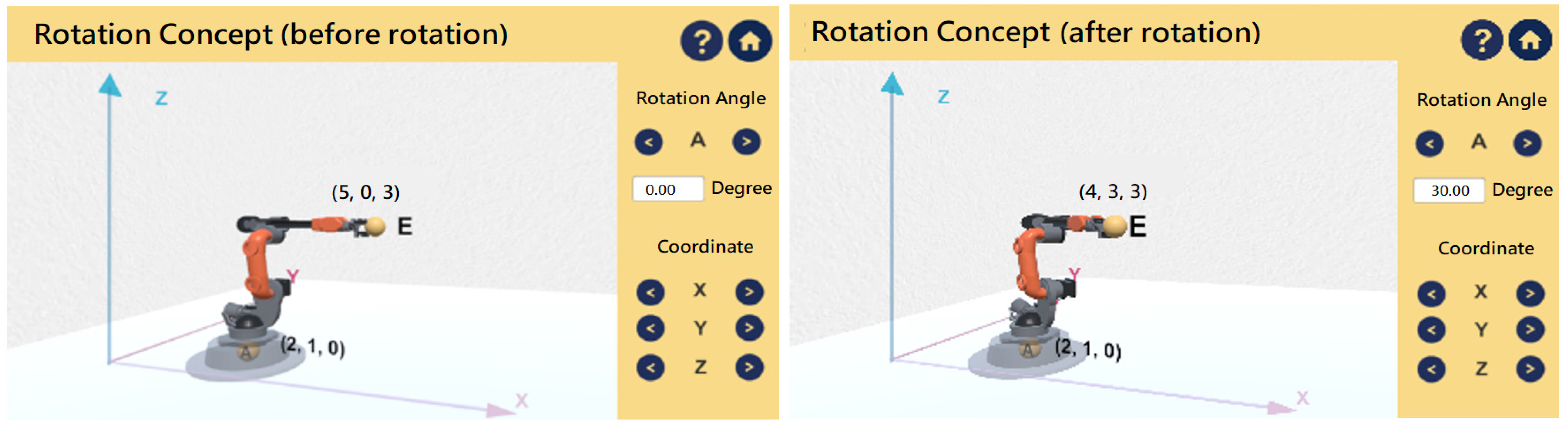 This task represents the final stage of the learning activity, with the primary goal of integrating concepts from previous tasks—spatial coordinates, vector representation, and rotation—to enhance learners’ understanding and application of spatial vectors in three-dimensional space. Compared to Task 2, which focuses on planar vectors, this task introduces more advanced features. Learners can manipulate both the rotational angles of individual robot axes and the overall orientation of the virtual robot, allowing them to fully observe and control changes in spatial coordinates and directionality.