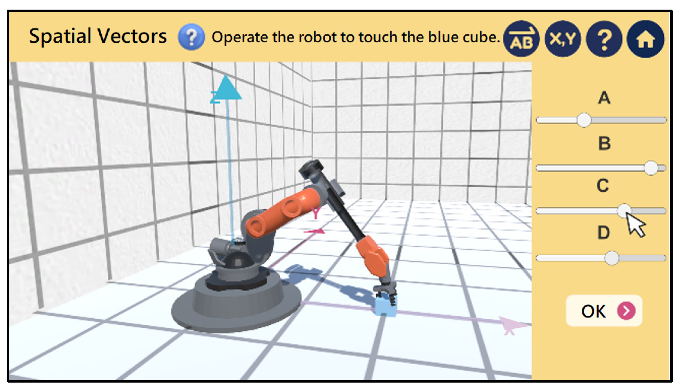 During the interactive process, learners observe how the virtual robot’s rotation and displacement in 3D space result in changes to its joint coordinates. This helps them understand the relationship between the start and end points of a vector and construct a conceptual framework for spatial vector representation. In the “Assessment” phase, a goal-oriented task is presented: learners must manipulate the virtual robot to change the direction and position of point E (the end effector) to contact a designated target block. Learners can adjust the angles of A, B, C, and D axis points to control the movement of the virtual arm, guiding its end to touch the square. Upon successful contact, the system displays the target’s coordinates, providing immediate feedback on the learner’s spatial estimation and vector reasoning skills. This task consolidates previously learned concepts while introducing greater complexity, effectively enhancing learners’ understanding and operational proficiency with spatial vectors in a three-dimensional environment (