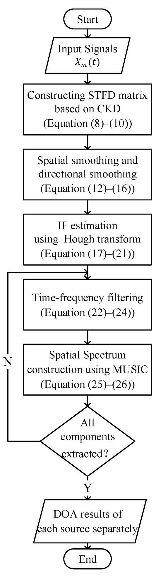 - Cui, K.; Chen, X.; Huang, J.; Yuan, N. DOA estimation of multiple LFM sources using a STFT-based and FBSS-based MUSIC algorithm. Radioengineering 2017, 26, 1126–1137. [Google Scholar] [CrossRef]