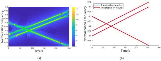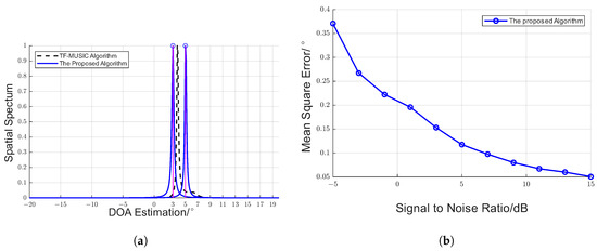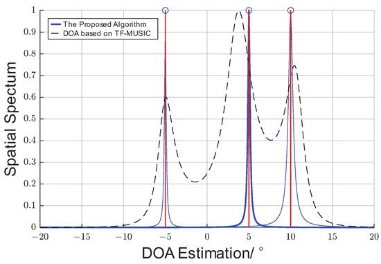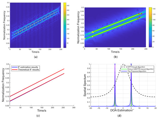 - The proposed algorithm performs time–frequency filtering on each signal source individually based on the results of IF estimation and obtains DOA estimation results by constructing a spatial spectrum using the MUSIC algorithm. Compared with the classical MUSIC algorithm, the proposed algorithm can support underdetermined conditions; that is, it does not require the number of signal sources to be less than the number of array elements.