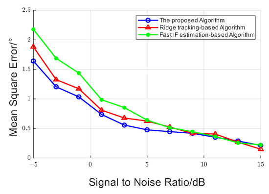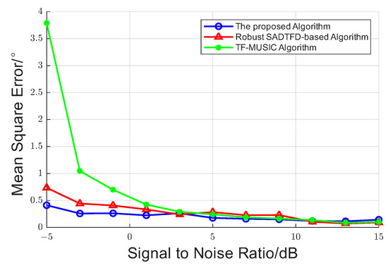 - The proposed algorithm performs both spatial smoothing and directional smoothing on the STFD matrix to further eliminate the influence of cross-terms. Meanwhile, it employs the Hough transform for IF estimation. Compared with the method of selecting points after filtering by setting an energy threshold, this approach further filters out the time–frequency points that do not lie on the IF trajectories, thereby improving the accuracy of the DOA estimation algorithm in low-SNR environments.