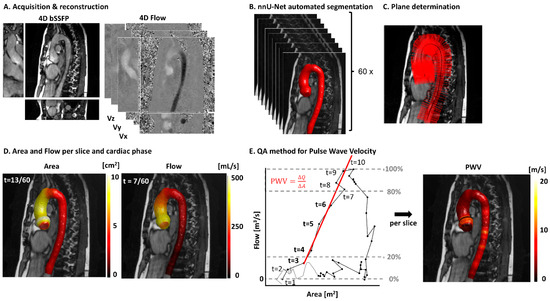 In view of the limitations of current methods to determine local aortic PWV, the aim of this work was to develop a pipeline to assess aortic PWV along the entire length of the thoracic aorta using the flow–area (QA) method (PWVQA). The QA method estimates PWV by calculating the ratio of changes in flow to changes in cross-sectional area during the reflection-free phase of the cardiac cycle in early systole [4,14]. To achieve this, two high-resolution 4D MRI scans were combined: a 3D cine balanced steady-state free precession (bSSFP) sequence capturing dynamic aortic geometry changes and a 4D flow MRI measuring blood flow variations. This study provides a proof of concept for the proposed approach, including scan–rescan reproducibility in six healthy volunteers and additional feasibility testing in six individuals with Marfan syndrome, and reflects on associated challenges and future directions.