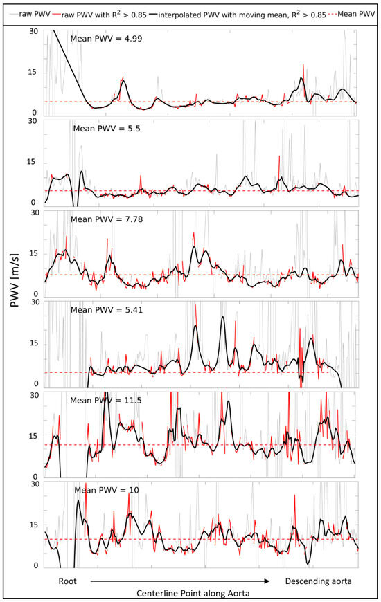 Pulse wave velocity (PWV) measures starting from the root to the descending aorta for all 6 Marfan patients. Raw PWV (gray), raw PWV with R2 > 0.85 (red), and smoothed, interpolated PWV (black) over the length of the thoracic aorta. The mean PWV based on the red line (raw PWV with R2 > 0.85) is indicated with a red striped horizontal line.