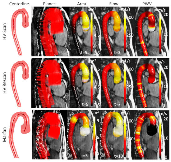 In Figure 3, the segmentations, centerlines, area, flow, and PWV maps of a scan and rescan of one example subject and one Marfan patient are displayed.