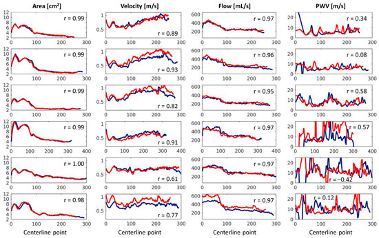 The scan (blue) and rescan (red) results for the maximum area, maximum average velocity, maximum flow, and local PWV per centerline location can be found in Figure 4, in which each row corresponds to one of the six volunteers. The mean ± standard deviation of the Pearson correlation coefficients for area was 0.99 ± 0.00, for velocity 0.82 ± 0.11, for flow 0.96 ± 0.01, and for PWV 0.20 ± 0.35. The median (Q1-Q3) of the average PWVQA for scan was 6.6 (5.4–9.4) m/s and for rescan was 9.1 (6.7–11.3) m/s, and its inter-examination differences were not significant (p = 0.16). The normality of the difference distribution of the data was assessed using the Shapiro–Wilk test, which indicated a significant deviation from normality (p = 0.02). As a result, Bland–Altman analysis was not performed.