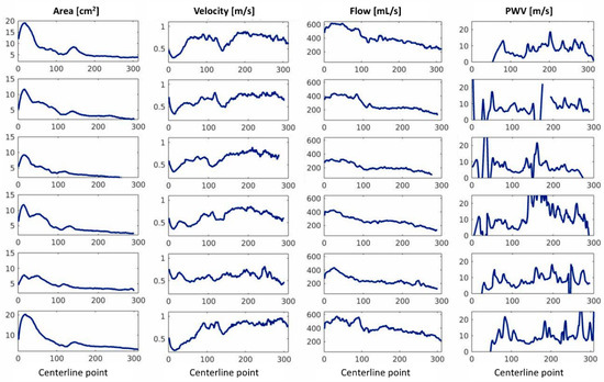 The maximum area, average velocity and flow, and local PWV for the six Marfan patients can be found in Figure 5. Again, each row corresponds to one subject. The median (Q1–Q3) of the average PWVQA for the Marfan patients was 7.1 (6.9–8.0) m/s.