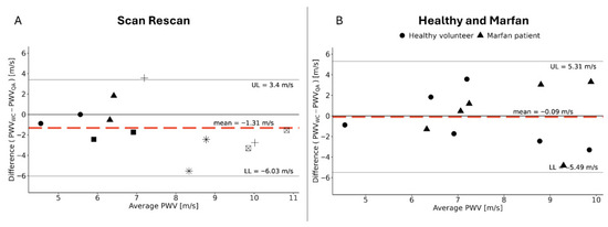 A Bland–Altman graph of PWVWC in comparison with PWVQA. (A) The scan and rescan measurements of the healthy volunteers; each shape corresponds to one subject. (B) Measures for the first scan of the healthy volunteers and those of the Marfan patients, with the shapes indicating to which group a measurement belongs.