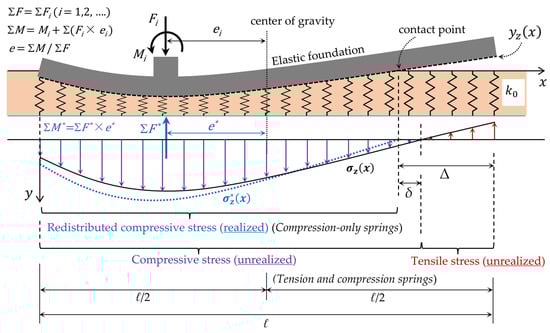 In Figure 1, is a function of the compressive and tensile base stress calculated by traditional linear analysis, represents the redistributed compressive base stress that in reality occurs under the foundation and is attempted to be determined by non-linear optimization methods, is the total external load, is the total external bending moment at the center of gravity of the foundation, is the total base force obtained by the redistributed compressive base stress, is the total base bending moment at the center of gravity, considering redistributed compressive base stress. Figure 1 contrasts two different interpretations of a foundation on Winkler springs: the classical linear-elastic model, and a more realistic, non-linear “compression-only” model requiring an optimization approach. In this context, Hetenyi’s [] deflection expression is considered in defining the elastic baseline. While Hetényi’s linear solution provides the mathematical foundation, a direct application of this is insufficient for cases with significant uplift of foundation. In order to enforce a “compression-only” condition, it is necessary to make a modification, which leads to the crucial phenomenon of stress redistribution over the actual contact area.