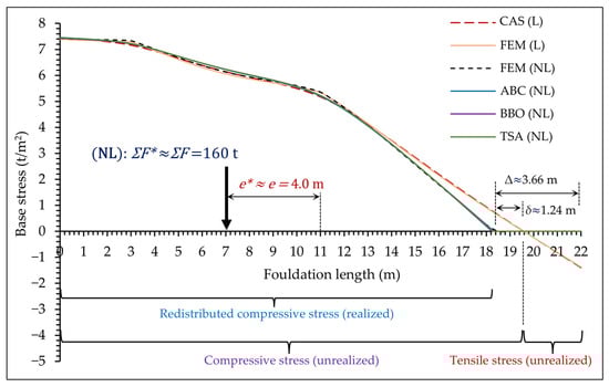 This research contributes a comprehensive mathematical model and algorithm for continuous foundations with non-linear stress behavior under high eccentricity, specifically focusing on the often-neglected issue of tensile stress redistribution. While previous studies [,] concentrated on rigid foundations, this work extends the analysis to elastic foundations for a more complete understanding of stress behavior on the Winkler soil model []. A novel methodological method is introduced by incorporating correction factors into a classical analytical solution for elastic beam deflection, shortly defined as CAS for this study, described by Hetényi [] and utilizing multiple meta-heuristic optimization techniques (ABC, BBO, TSA). To the authors’ knowledge, this combination of techniques to determine stress distribution, particularly concerning tensile stresses in continuous foundations, is unprecedented. By filling this gap, the study provides both theoretical advancements and practical engineering solutions, supported by a computational tool for optimization problems in foundation engineering.