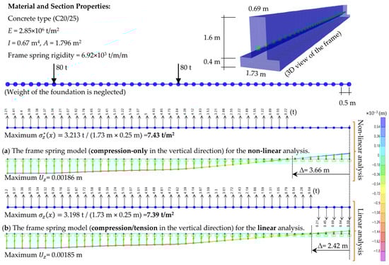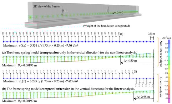 A prevalent approach is to represent continuous beam foundations with a frame element using a series of discrete elastic springs, but this increases the model’s intricacy by introducing non-linear behavior (such as variable stiffness or compression-only constraints) that makes it difficult to identify and redistribute the resulting stresses [,].