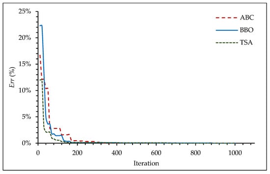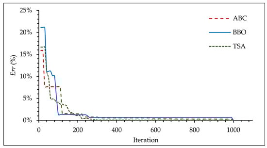 In Table A2, the Number of Food Sources (NFS) and the “limit” parameter are tuned for the ABC algorithm. A combination of NFS (50) and limit (50) is selected to provide the most robust solutions. For the BBO algorithm, the Number of Habitats (NH) and Mutation Probability (MP) are tested. Values of NH (100) and MP (0.01) are chosen as the best balance solution accuracy with computational cost. For the TSA, after tuning the Number of Trees (NT) and Search Tendency (ST), the combination of NT (30) and ST (0.5) is adopted as it yielded the most precise results. For all algorithms, the optimization process is terminated after a maximum of 1000 iterations or if the error function’s value remains negligible over 50 consecutive generations.