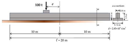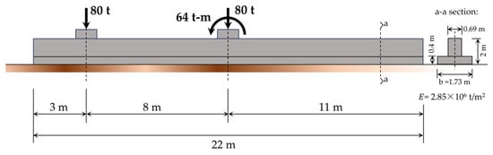 The example problem presented by Keskinel and Kumbasar [] investigates a continuous beam with a length (ℓ) of 22 m, flexural stiffness (EI) of 1.89 × 106 t-m2, foundation width (b) of 1.73 m, and a soil bedding coefficient () of 4000 t/m3 (Figure 2). The foundation is subjected to the total external load () of 160 t and moment () of 640 t-m, resulting in eccentricity () of 4.0 m from the center of gravity. As presented in Appendix B.1, the search space for the correction factors using the fixed eccentricity method is determined as [0.995, 1.005].