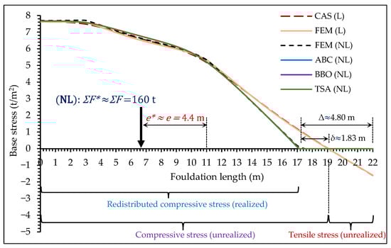High and unpredictable horizontal forces, or a large load eccentricity, can cause a foundation to partially uplift, resulting in a loss of contact and redistribution of the base stress. In such cases, determining the base stress distribution by simple linear static analysis leads to a significant calculation fault, such as unrealized tensile base stress. Since no remarkable tensile interaction occurs between the base and the foundation surface, only the redistribution of compressive stress will take place. This situation indicates that the analysis must be performed with non-linear methods. Figure 1 provides a comprehensive description of this case under the effect of any number of superstructural loads. The value δ is defined as the distance between two points: the actual contact point and the theoretical zero-stress point from the linear analysis. The distance from the foundation edge to this contact point is the non-contact length (Δ). Additionally, the contact point also indicates the start of the redistributed compressive stress.