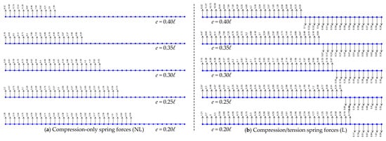 In order to validate the proposed optimization methods, the Finite Element Method (FEM) is conducted the SAP2000 [] structural analysis software. In the modeling approach using frame elements, linear analysis (L) with standard tension/compression springs, and non-linear analysis (NL) incorporating contact effects with compression-only springs to model foundation uplift are employed. The non-linearity in FEM analysis is confined exclusively to contact non-linearity at the base. Thus, the changing boundary conditions are redefined as the foundation loses and regains contact with the support springs. In addition, the material models for the foundation body remain linearly elastic.