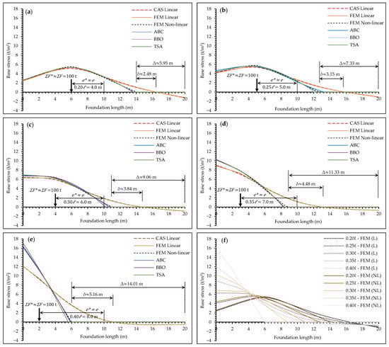 This section presents the results of the stress distribution analysis conducted on continuous foundations. Initially, foundation cases are analyzed using the conventional linear approach. Then, the efficacy of the proposed optimization model in accurately determining the stress distribution in cases of large eccentricity is evaluated. To facilitate these calculations, a MATLAB []-based computational tool is developed for stress determination, with the source code available in the reference []. The results are verified by those of the Finite Element Method (FEM). For this purpose, linear (L) and non-linear (NL) analyses are performed with the SAP2000 V20 [] structural analysis software, modeling the beam foundation using frame elements. In a standard linear analysis using SAP2000, spring elements exhibit both compression and tension behavior. However, to model the foundation’s compression-only response, a non-linear analysis case must be utilized. In addition, the classical analytical solution proposed by Hetényi [] for solving a specific problem of an elastic beam deflection on Winkler soil is abbreviated as “CAS” in all figures and tables.