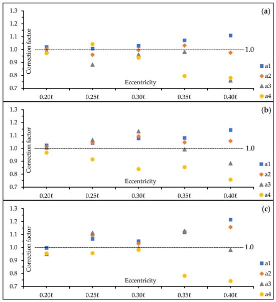 Therefore, instead of adopting a single fixed range, this study employs a dynamic eccentricity-dependent search space. For any given analysis with eccentricity, the optimal bounds [LB, UB] for the correction factors are calculated using Equations (A3) and (A4):
