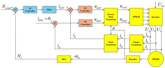 The PMSM servo system utilized in this study is based on a field-oriented control (FOC) strategy, specifically employing an control method. The overall control structure is depicted in Figure 1. The system features a conventional dual-loop feedback control architecture, consisting of a speed control loop and a current control loop. The control process unfolds as follows. The reference speed is compared with the actual rotor speed obtained from motor feedback. The resulting speed error is then processed by the speed controller, which outputs the q-axis reference current in the rotor rotating reference frame. In accordance with the control strategy, the d-axis reference current is set to zero. The error signals generated by comparing the d-axis and q-axis reference currents with the motor feedback currents serve as inputs to the current control loop. Following coordinate transformation, these signals are processed by a sinusoidal pulse width modulation (SPWM) module to generate PWM waves that drive the inverter circuit. The inverter then produces a series of pulse signals to simulate sinusoidal voltages, thereby energizing the motor. Both the speed and current loop controllers are typically implemented as PI controllers.