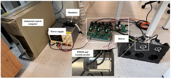 Figure 2 illustrates the measurement setup of the PMSM servo experimental platform, which consists of a power supply, an industrial control computer, a simulator, a driver, a PMSM, and a coaxial encoder. The industrial control computer is responsible for sending speed commands and adjusting the parameters of the PI controller, while the simulator is tasked with programming the programs into the driver. The driver integrates a dual-loop controller for current and speed, SPWM, and a three-phase inverter module. The encoder detects the rotor position of the motor in real time at a sampling frequency synchronized with the control cycle, converting the mechanical angle into electrical pulse signals that are fed back to the driver. Additionally, a first-order low-pass filtering algorithm is employed for signal processing to mitigate the impact of noise. The power supply for the measurement setup is sourced from Sichuan University in Chengdu, China, the motor is supplied by Panasonic Electric Works (China) Co., Ltd. in Chengdu, China, and the remaining components are sourced from Leetro Automation Technology Co., Ltd. in Chengdu, China.