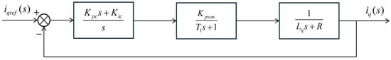 In practical systems, the SPWM module can be approximated as a linear element with a gain of 1, while the inverter can be modeled as a delay element with a time delay of 0.5 control periods. Additionally, the digital controller introduces a further delay of one control period. To simplify the analysis, these delay elements are typically approximated as first-order inertial components whose time constant is set to 1.5 control periods. Under the control strategy, a voltage feedforward compensation method is employed to effectively eliminate the influence of the motor speed, flux linkage dynamics, and d-axis inductance coupling terms on the q-axis voltage equation, thereby simplifying the controller optimization. The first-order low-pass filter can be approximated as a first-order inertial element. Similarly, the delay introduced by the encoder during position detection can also be regarded as an inertial element in the feedback path. These components affect the system’s phase margin and response speed to a certain extent and, therefore, must be carefully considered during controller optimization.