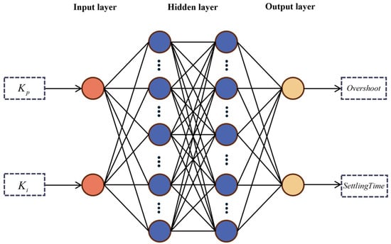To enhance the fitting accuracy of the neural network, two deep neural networks with two inputs and one output were constructed. The inputs are the design variables corresponding to the parameters of the speed loop PI controller, and the outputs are the differences between the overshoot and settling time calculated by the PMSM servo system model and the measured values. The training of the neural network is implemented using Python software version 3.13. To determine the appropriate network architecture, this paper takes the structure from similar tasks in the literature as an initial anchor, constructs a full factorial grid of 2, 3, and 4 hidden layers with 8, 16, 32, and 64 neurons per layer, and conducts a systematic search using the training–validation loss as the evaluation metric [,,]. The structure of the deep neural network is shown in Figure 5, which includes four fully connected hidden layers with 64, 32, 8, and 8 neurons, respectively. The activation function used is the LeakyReLU function with a hyperparameter of 0.2.