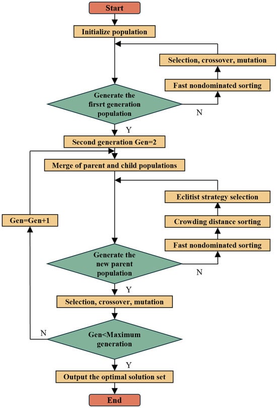 Intelligent optimization algorithms have been proven to be effective methods for obtaining the Pareto optimal solution set for multi-objective optimization problems. These algorithms approximate the optimal solution set of multi-objective problems by simulating biological evolution or swarm behavior in nature. In this study, five commonly used intelligent optimization algorithms, namely NSGA-II, MOGWO, SPEA2, MOEA/D, and MOPSO, are employed to solve the PMSM servo system optimization problem and obtain the optimal solution set. The five optimal solution sets are compared and analyzed to select the best design. Among them, the population size for the five optimization algorithms was set to 100, and the maximum number of iterations was set to 100. The crossover and mutation probabilities were set to 1 and 0.1, respectively. NSGA-II is a multi-objective optimization algorithm based on genetic algorithms. It employs fast non-dominated sorting, the elitist-preserving strategy, and the crowded-comparison operator to achieve efficient global search and maintenance of solution diversity in multi-objective optimization problems, as shown in Figure 6.
