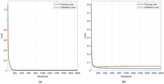 Figure 7a,b depict the loss curves of the two neural networks on the training and validation sets, which are employed to predict the discrepancies between the calculated values from the mathematical models and the actual measured values of overshoot and settling time in the servo system. The loss function employed is the MSE. Prior to training, the labels of both the training and validation sets were normalized. As the number of iterations increased, both the training and validation losses decreased rapidly and eventually stabilized. Moreover, the minimal difference between the training and validation losses indicates that the constructed models possess high prediction accuracy and good generalization capability.
