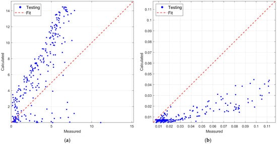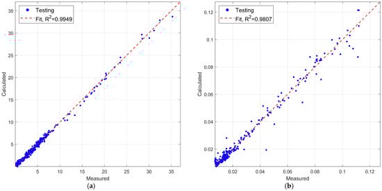 As illustrated in Figure 8, (a) and (b) display the scatter plots of the predicted values versus the measured values for the two optimization objectives, namely overshoot and settling time, as well as their respective coefficients of determination, which are 0.9949 and 0.9807. The horizontal axis represents the actual measured values of overshoot and settling time in the servo system, while the vertical axis denotes the predicted values obtained from the hybrid model combining the artificial neural network surrogate model and the mathematical model developed in this study. The red dashed line indicates the fit where the predicted values are equal to the measured values, and the points closer to this line represent higher prediction accuracy. It can be clearly observed from the figure that the hybrid model exhibits excellent linear fitting for the actual measured values of both objective functions, thereby demonstrating the high reliability of the artificial neural network surrogate model and the hybrid model.