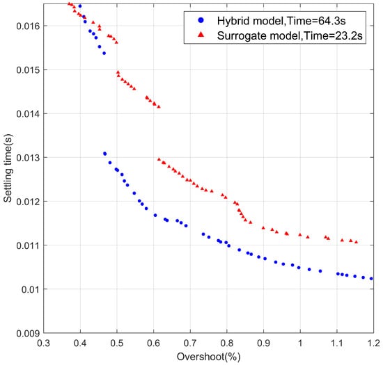 Table 2 lists the evaluation metrics used to assess the prediction accuracy of the two regression models, while Figure 10 illustrates the Pareto fronts obtained by the two models using the NSGA-II optimization algorithm, with the legend indicating the optimization time. The hybrid model integrates a neural network with a mathematical model to achieve prediction functionality, where the neural network component specifically predicts the error between the model-calculated values and the measured values of the servo system’s overshoot and settling time. In contrast, the surrogate model directly predicts the actual measured values of the servo system’s overshoot and settling time using an ANN model. As shown in Table 2, both models exhibit high prediction accuracy for the system’s actual measured values, thereby validating the reliability of the artificial neural network surrogate model and the hybrid model constructed in this study. Further comparison of the four evaluation metrics and the Pareto fronts in Figure 10 reveals that the hybrid model outperforms the surrogate model in all metrics, and the Pareto front obtained based on the hybrid model largely dominates that obtained based on the surrogate model. This indicates that the hybrid model has a significant advantage in fitting the nonlinear servo system, especially in resource-constrained scenarios for surrogate-assisted optimization. Under the same algorithmic framework, the optimization time of the hybrid model increases compared to the pure surrogate model. This phenomenon primarily stems from the computational complexity of the mathematical model component within the hybrid model.