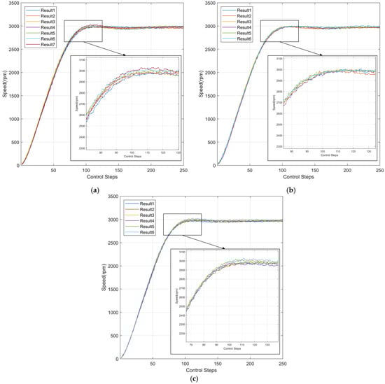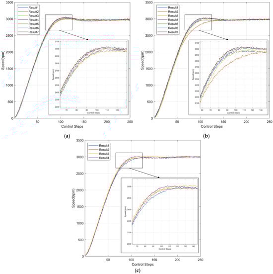 In engineering, the settling time typically refers to the duration from when the tracking speed first enters the range of of the steady-state value and thereafter remains within this boundary without exceeding it. In experimental measurements, the settling time is determined by the discrete sampling point that first satisfies this condition, with the corresponding time recorded as the settling time. As shown in the validation results in Table 3, the optimal solutions of the hybrid model and the surrogate model exhibit a uniform distribution in terms of the overshoot objective function, while displaying a certain step-like span in the settling time. This trend is consistent with the Pareto front shown in Figure 10, and the optimal solution set of the hybrid model predominantly dominates those of the surrogate model and the mathematical model, demonstrating superior performance in terms of distribution, particularly within the range of small overshoot objectives. In Figure 11, the vertical axis represents the tracking speed of the motor, while the horizontal axis denotes the control step number (i.e., the number of control cycles experienced). By comparison, it can be observed that the optimal solution of the hybrid model has the largest distribution range of overshoot, followed by the surrogate model. Within the same model, a faster rise in tracking speed implies a shorter time for the system to reach stability, but also a correspondingly larger overshoot, which is consistent with the validation results of the same model in Table 3. Result 2 in Figure 11 may be attributed to random system errors.