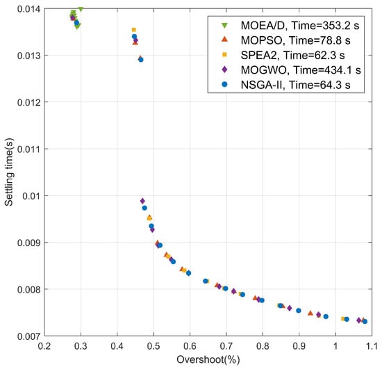 Table 5 and Figure 13 present the validation results of the Pareto fronts for the three algorithms, namely NSGA-II, SPEA2, and MOPSO, as well as the corresponding tracking curves. Overall, NSGA-II significantly outperforms MOPSO and SPEA2 in terms of search range and the number of optimal solutions. MOPSO performs better than SPEA2 in the search range of small overshoot and long settling time. However, in terms of the quality of optimal solutions, the optimal solution sets of the three algorithms are non-dominated when random error disturbances are ignored. This conclusion is consistent with the comparison of the Pareto fronts of the three algorithms shown in Figure 12. Moreover, Figure 13 clearly demonstrates that the solution search ranges of NSGA-II and MOPSO are superior to that of SPEA2. For the same algorithm, the optimal solution with a larger overshoot has a faster rise in tracking speed, and consequently, a shorter settling time.