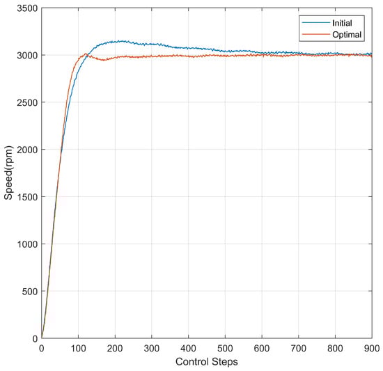 Table 6 and Figure 14 present detailed information on the optimization results and the corresponding tracking curves, respectively. The solution with an overshoot of 0.525% and a settling time of 0.0078 s was ultimately selected as the optimal solution. This is because further optimization of the overshoot would lead to a significant increase in the settling time, while optimization of the settling time would result in a substantial increase in the overshoot with only a small change. Compared with the results before optimization, the increase in the design variable , i.e., the proportional coefficient in the speed loop PI controller, leads to a reduction in the settling time while increasing the overshoot. The increase in the design variable , i.e., the reduction in the integral coefficient in the speed loop PI controller, indirectly reduces the overshoot while increasing the settling time. The optimal solution obtained in this study achieved an 89.7% reduction in the overshoot optimization target and an 80.1% reduction in the settling time optimization target. As shown in Figure 14, compared with the tracking curve before optimization, the optimized result has a smaller peak, i.e., a smaller overshoot, and the system can quickly reach stability at a control step number of 100, corresponding to a settling time of approximately 0.0083 s. Therefore, the proposed method of coupling the neural network surrogate model with the intelligent optimization algorithm, as presented in this paper, can be proven to be an effective approach for optimizing the PMSM servo system.