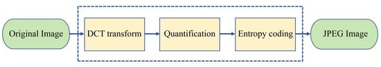 As illustrated in Figure 1, the JPEG compression process primarily comprises three key stages: the Discrete Cosine Transform (DCT), quantisation, and entropy coding. Following DCT transformation and quantisation, the resulting coefficients are termed DCT quantisation coefficients, stored in 8 × 8 coefficient blocks. The objectives of DCT transformation and quantisation are to maximise the number of zero coefficients (coefficients with a value of zero) while minimising non-zero coefficients. A higher proportion of zero coefficients enhances entropy coding efficiency, ultimately improving the compression quality of the final JPEG image. Currently, the most effective and mainstream approach in the field of JPEG reversible steganography is based on modifying the DCT quantisation coefficients. This involves altering the coefficients obtained after quantisation before applying entropy encoding to create the steganographic image. Consequently, the reversible steganography algorithm need not consider the entropy encoding stage depicted in Figure 1; analysis should focus solely on the DCT transformation and quantiser.