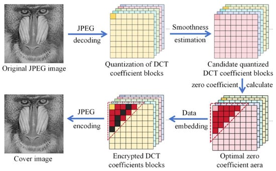 With the continuous development of social network and multimedia technology, JPEG compressed images have gradually become the mainstream image type due to their advantages in transmission bandwidth and storage space. After JPEG compression, the redundant information is greatly reduced, and the spatial domain algorithms cannot be directly applied to JPEG compression, so it is important to study the reversible algorithms that take into account the compression performance and embedding performance of the image. JPEG image processing usually includes the Discrete Cosine Transform (DCT), quantisation, and entropy coding, resulting in the loss of correlation between pixels. As a result, JPEG images usually exhibit lower redundancy compared to spatial domain images. Currently, there are three main reversible data hiding (RDH) methods for JPEG images: methods based on quantisation table modification [1,2,3,4], methods based on Huffman coding modification [5,6,7,8,9,10,11], and methods based on quantised DCT coefficient modification [12,13,14,15,16,17,18,19,20,21,22,23,24,25,26]. Currently, there are relatively few reversible information hiding algorithms based on the JPEG compression domain, and although they have high image quality, their embedding capacity is generally low, so they are only suitable for occasions such as image authentication that do not require high embedding capacity.